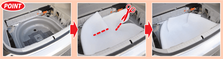 スペアタイヤハウスなどの空間がある場合は、吸音材にハサミで切り込みを入れると曲面になじみやすい。