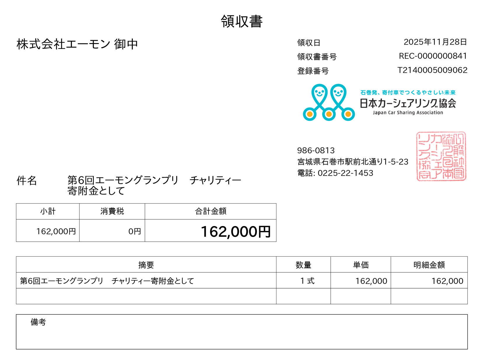 チャリティー販売の売上金は日本カーシェアリング協会様に全額寄付いたしました。