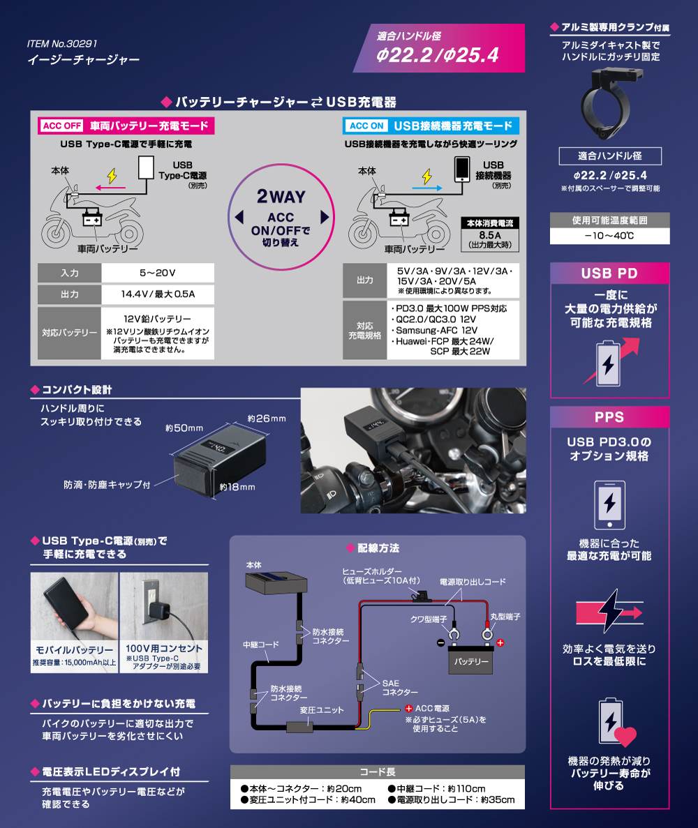 ・本製品の対応ハンドル径はΦ22.2mm, Φ25.4mmです。車両のハンドル径を確認してからご購入ください。
